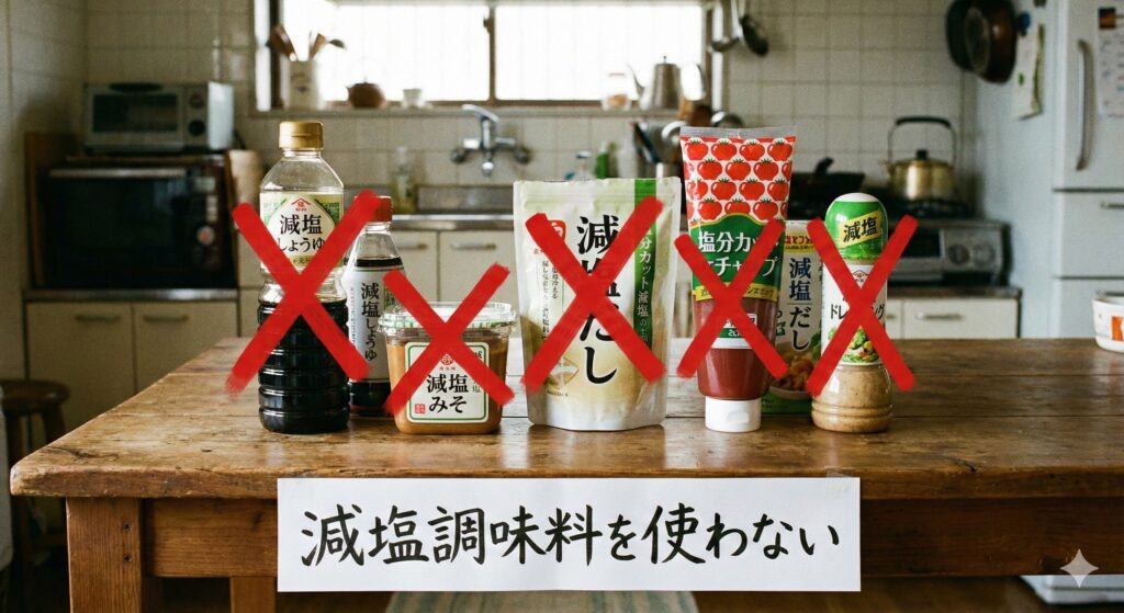 • 具体例:炒め物なら、仕上げの直前に鍋肌に醤油を数滴。サラダなら、ドレッシングを少量使い、代わりに引き立てのコショウやハーブを多めに加える。